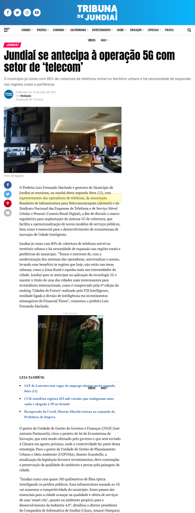 3. TRIBUNA DE JUNDIAÍ – Jundiaí se antecipa à operação 5G com setor de “Telecom”